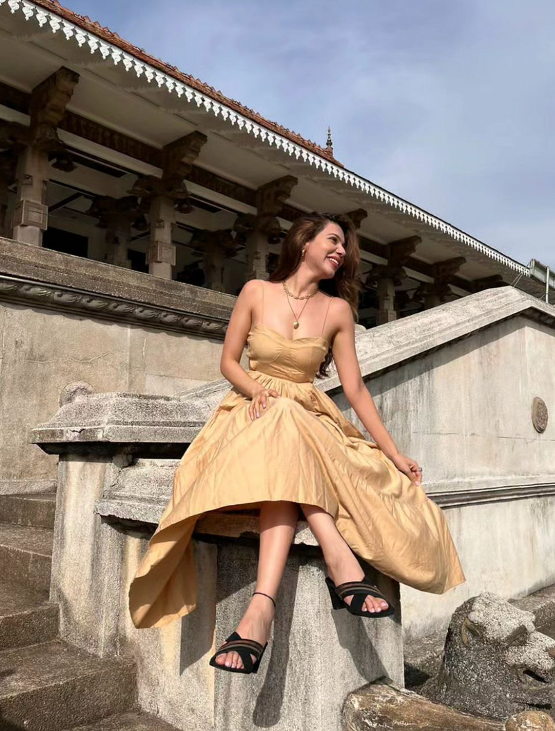 Noor makes its debut this season with her form flattering silhouette and tired twirling Skirt. Crafted from luxurious organic cotton fabric & the cut-out sides at the waist Noor is perfectly suited for all the occasions and effortlessly reads both fun and put together.